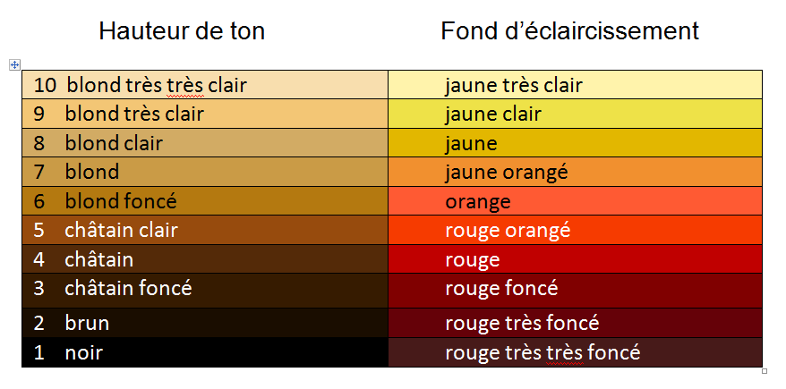 Le neutraliseur violet s’utilise après une décoloration, lorsque les mèches présentent souvent un reflet jaunâtre. En effet, l’élimination des pigments naturels du cheveu révèle des fonds d’éclaircissement jaunes sur les niveaux les plus clairs, comme illustré dans le tableau ci-dessous :